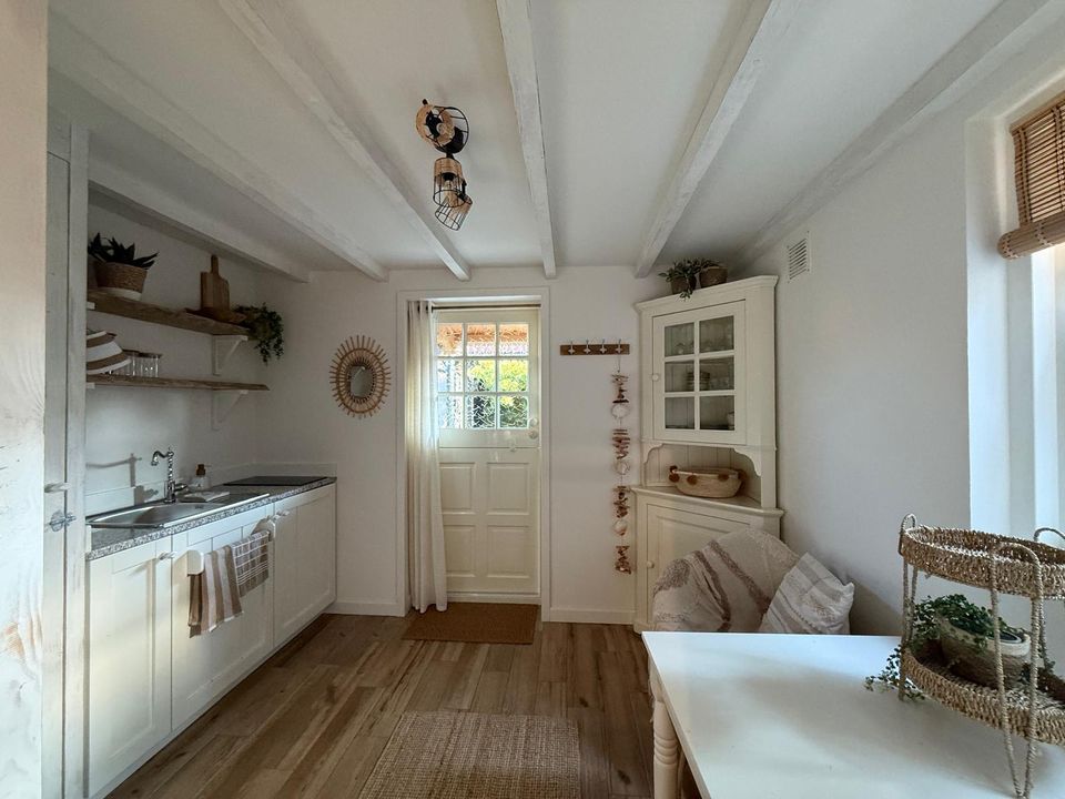 Sie schlafen in einem gemütlichen Alkovenbett, kochen in einer handgefertigten Küche und entspannen im Badezimmer mit Regendusche und poliertem Beton. Draußen erwartet Sie ein lauschiger Garten mit Veranda – perfekt für ein Glas Wein bei Sonnenuntergang.