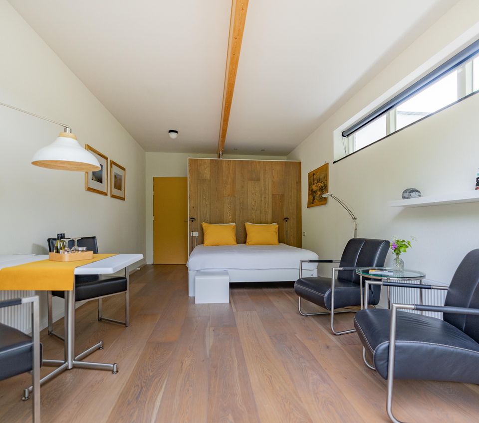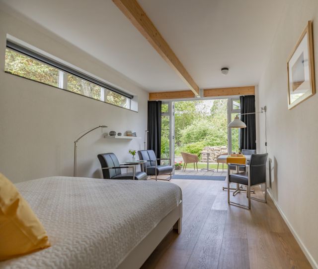 Jedes Zimmer befindet sich im Erdgeschoss und verfügt über einen eigenen Eingang. Die geräumigen, hellen und komfortabel eingerichteten Zimmer eignen sich perfekt für Paare oder Familien. Durch Glastüren gelangen Sie auf Ihre eigene Terrasse und in ein schönes Badezimmer mit Regendusche.