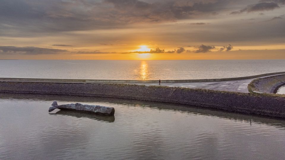 Friesland – Auf der Süd-Pier in Harlingen kannst du nicht nur wunderbar auswandern, sondern vor allem jede Menge sehen. Hier lag einst die Walrossdame Freya, die der Hafenstadt kurzzeitig weltweite Schlagzeilen bescherte. Heute wartet ein anderer Riese: der Wal von 11fountains. Hinter dir glänzt die Stadt, vor dir das Wattenmeer. Und an einem klaren Tag siehst du vielleicht sogar die Umrisse von Vlieland und Terschelling. Hinsehen, Entdecken und einen Moment genießen, der ruhig noch ein bisschen länger dauern darf.