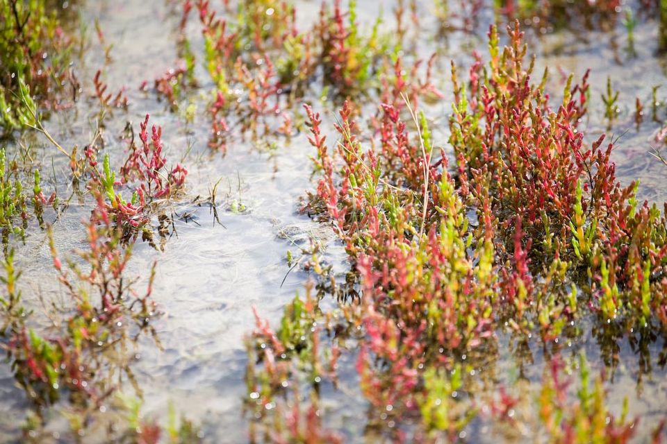 Bei Ebbe kommen hier Pflanzen ans Licht, die in Salzwasser leben können, wie Blasentang, Knotentang und Meerlattich. Auf den Marschwiesen an den Rändern des Wattenmeers finden sich Pioniersorten wie Schlickgräser und Queller. Diese Pflanzen halten das Schlick fest, wodurch die Marschen im Laufe der Zeit höher werden und auch andere Sorten eine Chance bekommen. Da wären zum Beispiel Strand-Wegerich, Strand-Dreizack und Salzmiere, aber auch Strand-Astern, die in der Blütezeit das ganze Marschland lila färben.