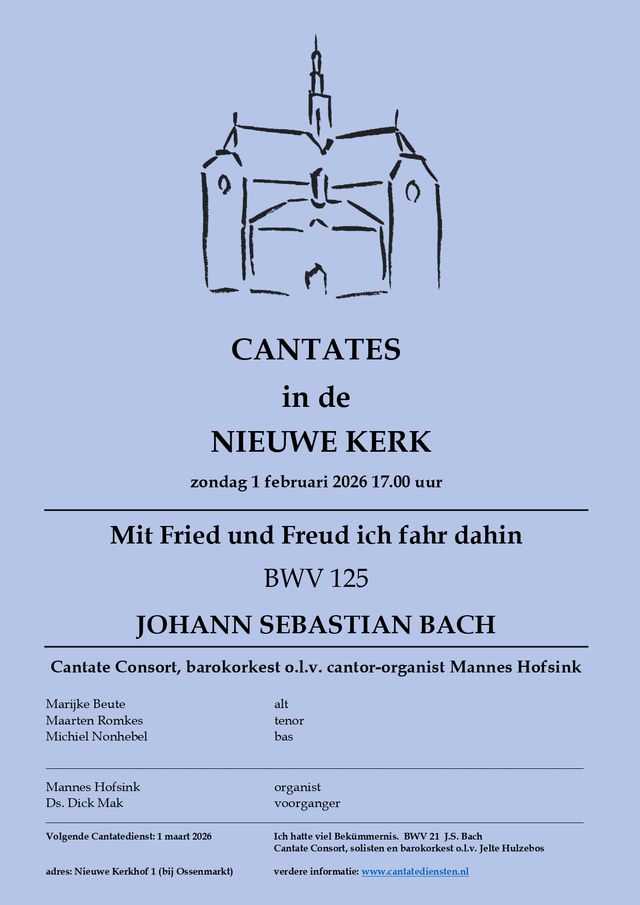 Zondag 1 februari 2026 Aanvang: 17.00 uur Toegang gratis, vrije gift Cantate ‘Mit Fried und Freud ich fahr dahin’ BWV 125, J.S. Bach (1685- 1750) Motet: ‘Herr, nun lässest du‘ - Felix Mendelssohn Cantate Consort en barokorkest o.l.v. cantor-organist Mannes Hofsink Marijke Beute alt Maarten Romkes tenor Michiel Nonhebel bas Voorganger: Ds. Dick Mak Organist: Mannes Hofsink Rond het feest van de Opdracht van de Heer in de tempel (Maria Lichtmis) klinken in deze dienst twee werken die beide het loflied van Simeon verklanken: ‘Nu laat Gij, Heer, uw dienstknecht in vrede heengaan.” Bachs cantate ‘Mit Fried und Freud ich fahr dahin’ is gebaseerd op Luthers lied over de lofzang van Simeon. De muziek ademt een diepe rust en vertrouwen in Gods belofte van verlossing. Mendelssohns motet ‘Herr, nun lässest’ du uit Opus 69 zet dezelfde tekst op een romantische, verstilde manier op muziek. Het motet vormt een intieme en eerbiedige afsluiting van de kersttijd.