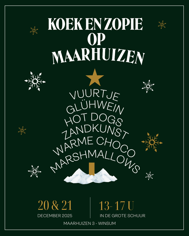 Maak een lekkere winterwandeling en stop onderweg bij onze Koek & Zopie. Rooster je eigen marshmallows of hotdogs boven het vuur, neem een glühwein of warme chocolademelk en warm even helemaal op bij het vuurtje. In de schuur kun je samen met een zandkunstenaar bouwen aan een kerstdorp van zand, een mooie activiteit voor jong en oud!