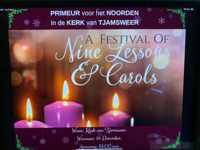 Zondagavond 14 december vindt er een bijzondere uitvoering plaats van ‘ A FESTIVAL OF NINE LESSONS AND CAROLS’ vertaald in het Nederlands en uitgevoerd door het Vocaal Ensemble Het Hoogeland, solist Ursula Duin en organist Wouter Schep de muzikale leiding is in handen van Vincent Hensen-Oosterdijk. De toegang is gratis, wel wordt na afloop een bijdrage op prijs gesteld. Aanvang 19.00 uur.