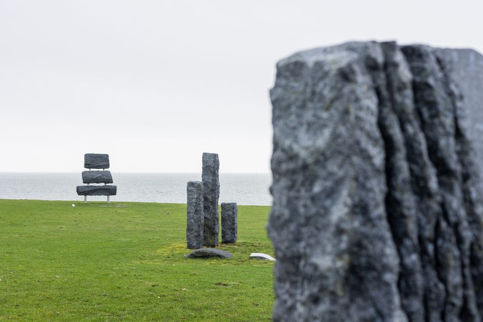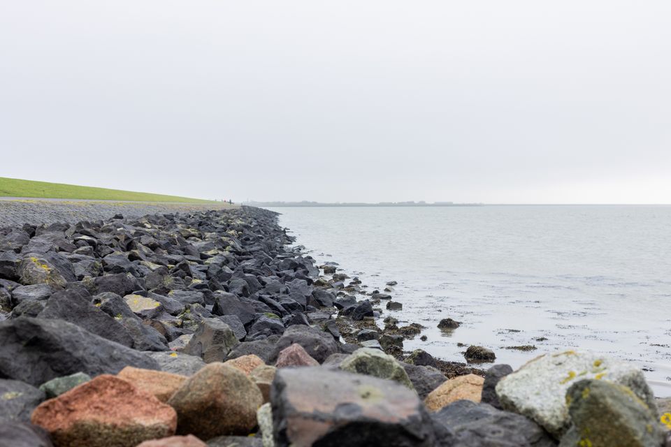 Meine Wanderung führt mich am Hafen vorbei und am Watt entlang in Richtung des Wattenmeerdeiches. Heute ist Schmuddelwetter und weil gerade Ebbe ist, glänzt das Schlick im gleichen Grauton wie der Himmel. Den vielen Vögeln hier ist das Wetter egal, sie ruhen sich entspannt auf dem trockengefallenen Meeresboden aus. Mit einem Fernglas kann man sich die Vögel in Ruhe ansehen. Wenn man hier so wandert, entlang dieser kargen Weite, dann hat man fast das Gefühl, man wäre ganz allein auf der Welt. Ich liebe dieses Gefühl. Und nicht nur die Landschaft ist ein Kunstwerk an sich, man kommt auch an echter Kunst vorbei. Zum Beispiel an “Beelden uit de zee” (Skulpturen aus dem Meer) - Granitblöcke, die aus einem Schiffswrack geborgen und auf dem Deich zu einem Kunstwerk verarbeitet wurden.