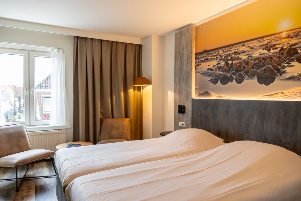 Hinter dem Waldstück wandere ich über den Groene Strand und schließlich wieder nach West hinein. Dann klettere ich noch auf die Seinpaaldüne - das ist meine Lieblingsstelle auf der Insel. Hier hat man die schönste Aussicht auf die hohen Dünen bei Paal 2 und bei gutem Wetter kann man sogar die Nachbarinsel Vlieland sehen! Ich genieße einen Moment die Aussicht und dann ist es an der Zeit, mich aufzuwärmen und bei Pura Vida, mitten im Dorf, einzukehren. Pura Vida ist eine relaxte Foodbar mit einer Wandmalerei von einem Oktopus, die den hippen Charakter dieses Lokals noch unterstreicht. An einer Seite des Restaurants lädt eine gemütliche Sitzecke mit Kissen zum Ausspannen ein. Nach dem Essen schlendere ich zufrieden zu meinem Hotel, dem Hotel NAP, am Fuß des roten Leuchtturms. Eine angenehme Unterkunft an einem wunderbaren Ort. Das Hotel ist warm und gemütlich und steht für mich an der perfekten Stelle.