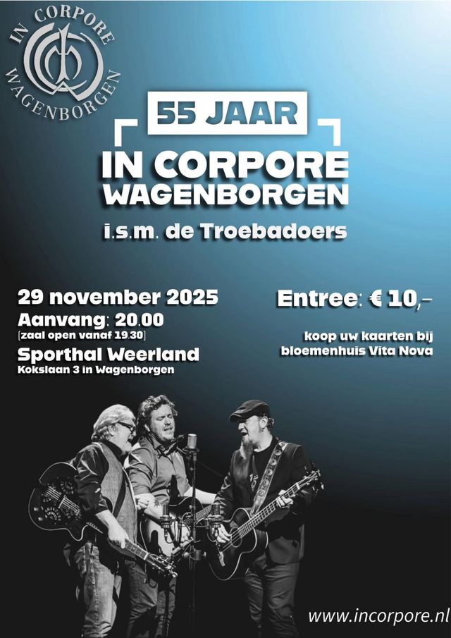 Muziekvereniging In Corpore Wagenborgen bestaat 55 jaar. Dit wordt gevierd met een concert i.s.m. de Troebadoers.