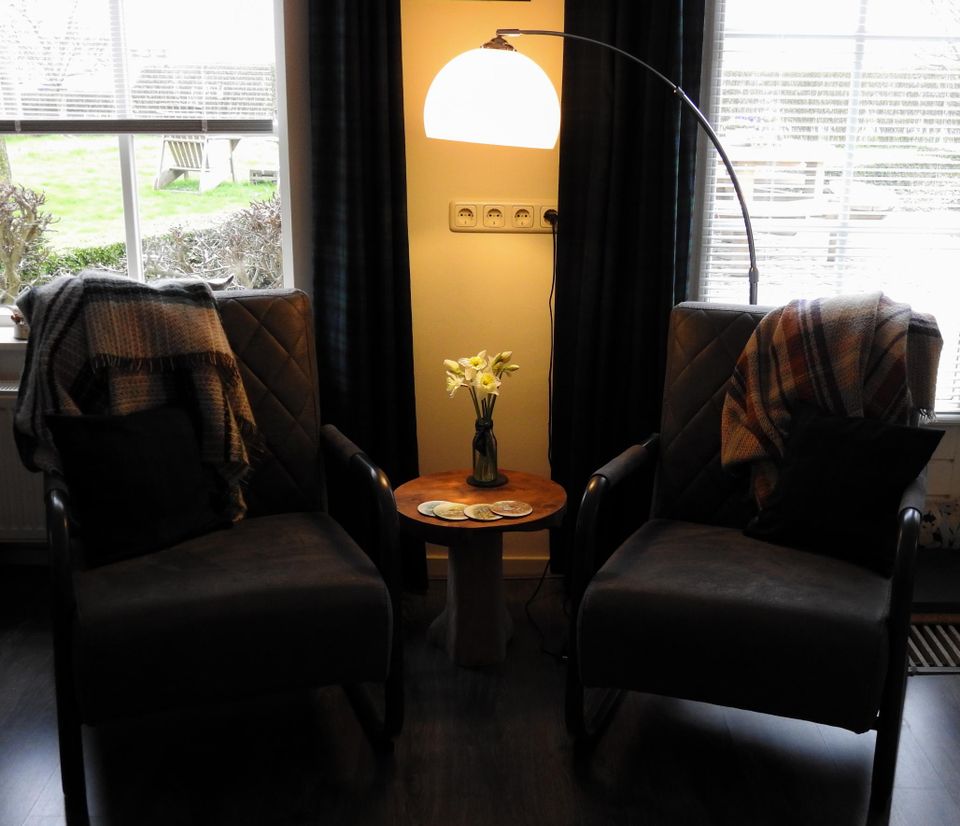 From the guesthouse, you overlook the front garden, where you'll find various seating areas and can enjoy beautiful views. If the weather's nice and you want to have breakfast at the picnic table, no problem, I'll serve it outside!