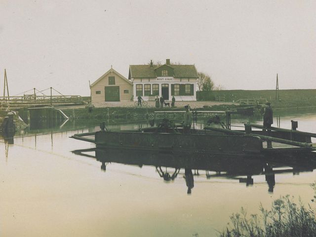 The excavation of the Molenvaart was completed in 1852. In 1863, a lock with a bascule bridge was built. The connection between the Molenvaart and the canal was necessary because it was an important transport route for the flower bulbs. In 1892, J. Langedijk was employed as the lock and bridge keeper by the municipality of Anna Paulowna. Langedijk had a stone house with a café built on the canal side of the dike. This house was named Westeinde, after the western point of the polder. The café was visited by ship's crew, draught horse drivers and passers-by. In the years after 1920, truck drivers also became customers of the skippers' café. In 1946, Langedijk sold the house with café to J. Grin. He was appointed as a lock and bridge keeper in the service of the municipality of Anna Paulowna. Due to the reduction of shipping and the increase in truck transport, the municipal council decided in 1968 to remove the bascule bridge over the Molenvaart, close the lock and build a road over the former lock. In 1971, the house, of which the café part was no longer in use, was sold to C. van den Berg. This was officially the end of café West-Einde: a social meeting point for travellers and residents of the Anna Paulownapolder. Since 2018, the house has been restored and made energy-neutral by the current owner.