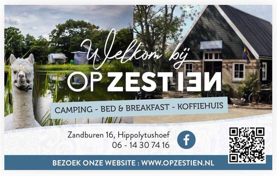 Op Zestien is een gezellige en gastvrije locatie in Hippolytushoef. Hier komen camping, Bed & Breakfast en lunchroom samen op één sfeervolle plek. Gasten kunnen overnachten op de camping of kiezen voor een comfortabel verblijf in de B&B-kamers. Overdag ben je welkom in de lunchroom voor koffie met huisgemaakt gebak, een uitgebreide lunch of een kleine versnapering.