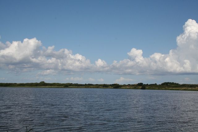 Brakwaterplas met veel eenden en waterral.