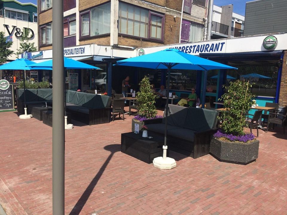 Neem plaats op het grote terras met uitzicht op het NS-station en de watertoren. Even zitten, proeven en genieten in het hart van Den Helder