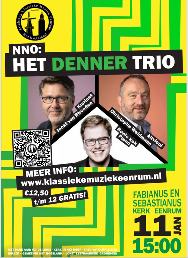 Een mooi begin van het nieuwe jaar: Het Dennertrio, bestaande uit Joost van Rheeden (Solo-klarinettist bij het Noord Nederlands Orkest, NNO), Christophe Weidmann (Solo-altviolist bij het NNO) en pianist Roele Kok zullen een prachtig e gevarieerd programma spelen bij Kamermuziekserie Eenrum Klassiek. Met dit concert zetten wij de samenwerking met het NNO voort. Jaarlijks speelt minimaal een Ensemble van dit prachtige orkest in onze serie. Na afloop is er een -in de prijs inbegrepen- meet and greet met de musici