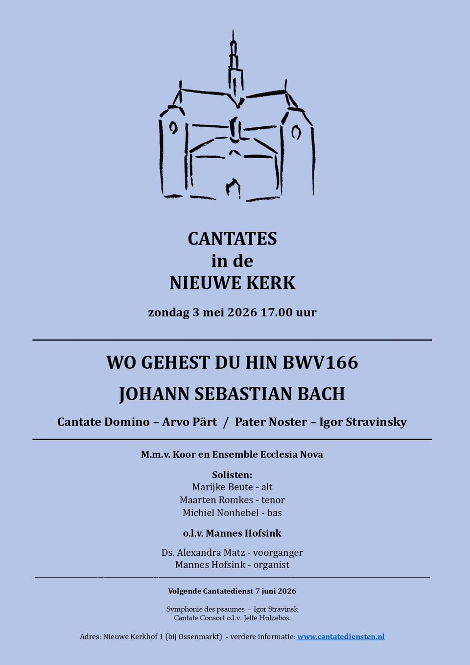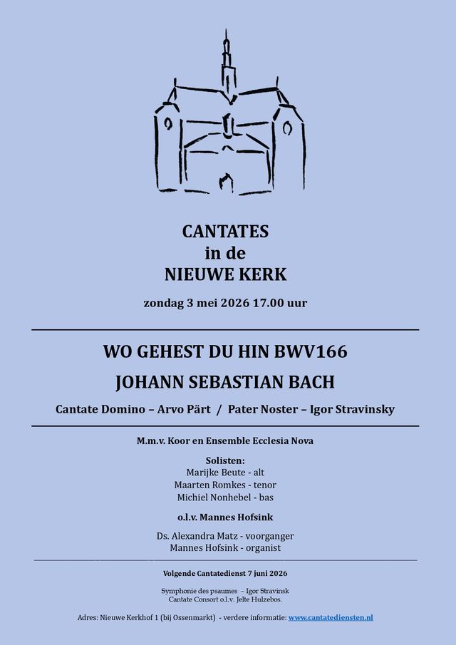 Cantatedienst Nieuwe Kerk Groningen Zondag 3 mei 2026 Aanvang: 17.00 uur Toegang gratis, vrije gift Wo gehest du hin? BWV 166 J.S. Bach Cantate Domino Arvo Pärt (1935) Pater Noster Igor Stravinsky (1882 – 1971) Koor, solisten en Ensemble Ecclesia Nova o.l.v. Mannes Hofsink Marijke Beute alt Maarten Romkes tenor Michiel Nonhebel bas Voorganger: Ds. Alexandra Matz Organist: Mannes Hofsink Op deze zondag Cantate staat Bachs cantate ‘Wo gehest du hin?’ centraal. Een werk dat de vraag stelt naar onze levensrichting en bestemming. Vanuit Johannes 16 klinkt de oproep tot bezinning: waarheen zijn wij onderweg, en wie leidt ons? Daaromheen klinken twee meditatieve werken uit de 20e eeuw. Arvo Pärts Cantate Domino (Psalm 96) is een ingetogen lofzang, gedragen door een spirituele eenvoud. Stravinsky’s Pater Noster is een sobere zetting van het Onze Vader, waarin gebed en contemplatie samenkomen.