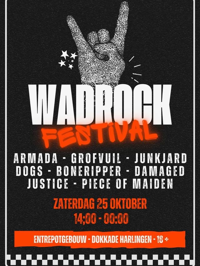 Op zaterdag 25 oktober verandert het Entrepotgebouw in het ruige terrein van het Wadrock Festival. Vanaf 14.00 uur tot middernacht gonst de zaal van het geluid van gitaren, dreunende drums en scheurende vocalen. Rock- en metalliefhebbers kunnen hun hart ophalen wanneer de energie van Armada, Grofvuil, Junkyard Dogs, Boneripper, Damaged Justice en Piece of Maiden het publiek meesleurt in een onvergetelijke muzikale storm.