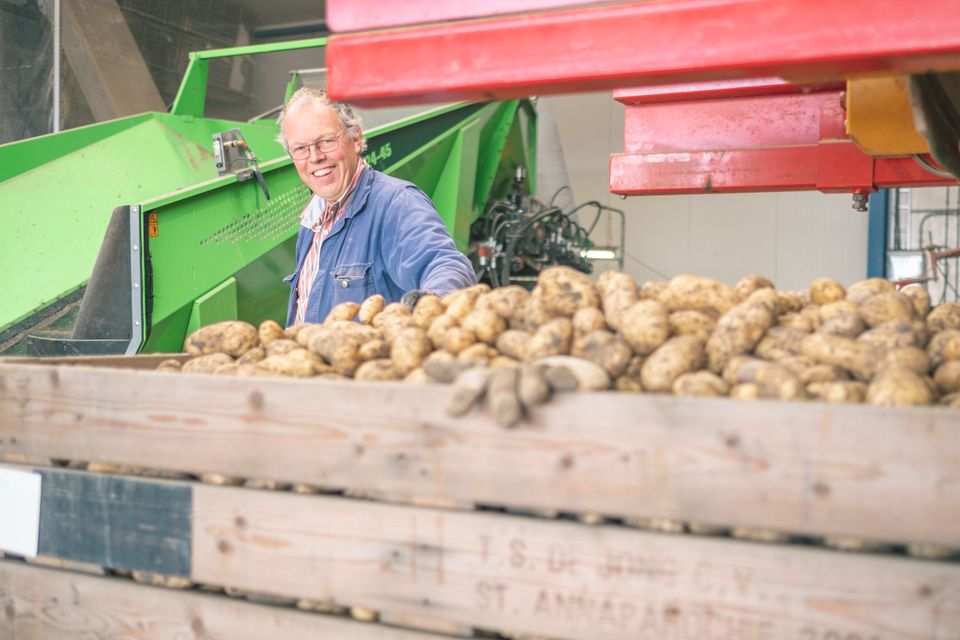 De oogst van de aardappelen vindt meestal plaats na half augustus. Ze worden vervolgens bewaard in de bekende boxen of kisten, vaak duizenden kilo's tegelijk. De aardappelen worden vervolgens goed geventileerd om ze droog te houden. Om de schil namelijk goed hard te kunnen laten worden, moeten ze nog zo'n drie weken afrijpen. Wanneer je meteen begint met sorteren, wordt de kans groter dat de aardappelen beschadigen.