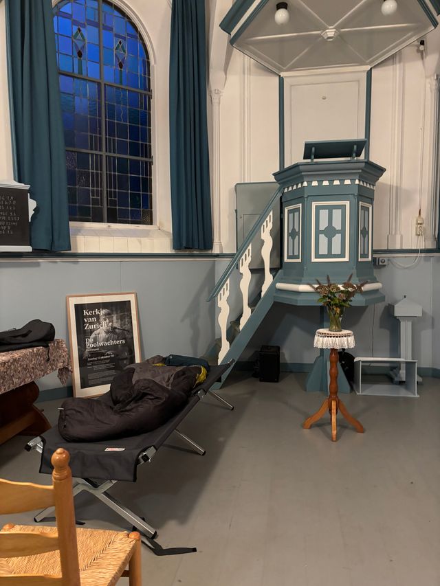 In Zurich wacht een vrijwilliger haar op met een sleutel en een glimlach. Samen klappen ze de stretcher uit tussen de blauwe muren van de dorpskerk. “Toen zij wegging, dacht ik wel: ik ben helemaal alleen in een kerk, met een kerkhof,” vertelt Roos. Ze lacht. “Maar het voelde goed. Ik heb wat lampjes aangelaten, dat was genoeg.”