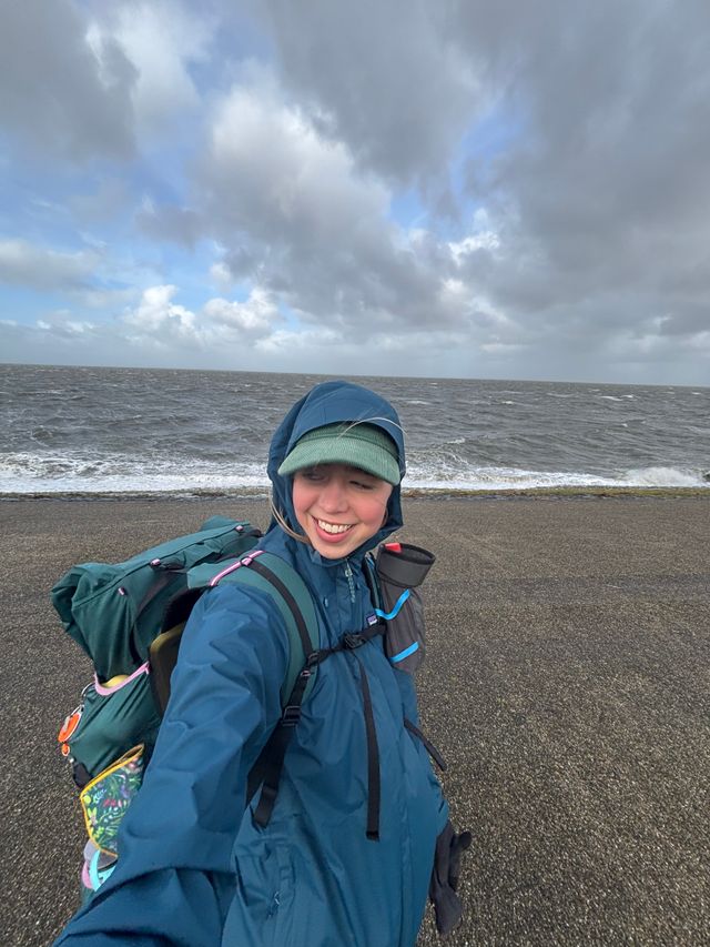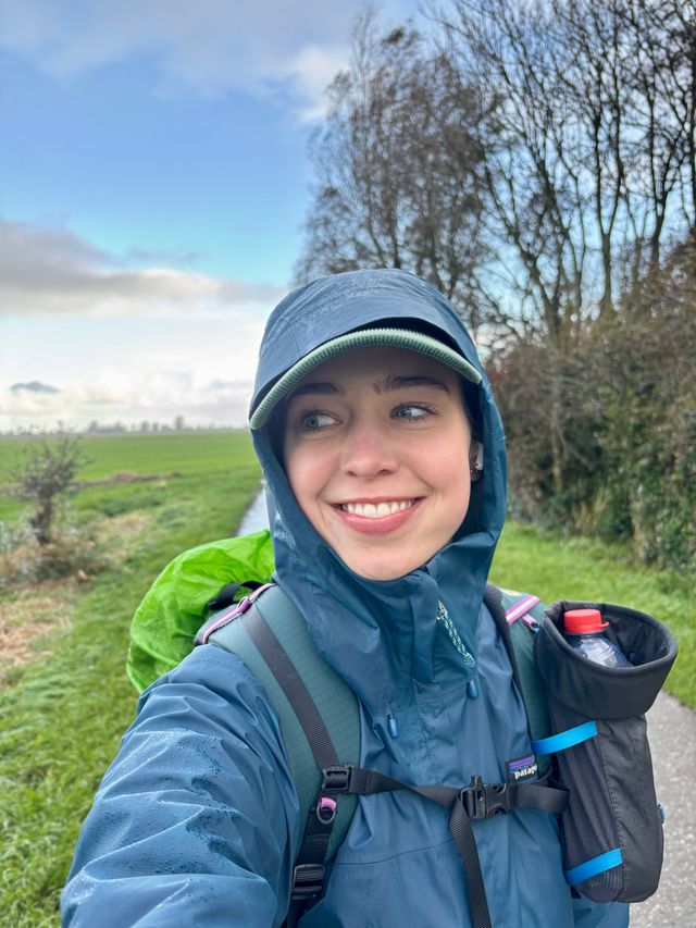 Voor Roos is het weer nooit bepalend. “Ik zie regen als onderdeel van het wandelen. Het hoort erbij.” Ze is gewend aan het ritme van dagen buiten, in beweging. “Goede schoenen, een rugzak en gewoon gaan.” Terwijl ze richting Peins loopt, trekt de lucht open. In de verte loopt een kudde schapen over de dijk. De wind ruist door het gras. Rustiger dan dit wordt het niet.