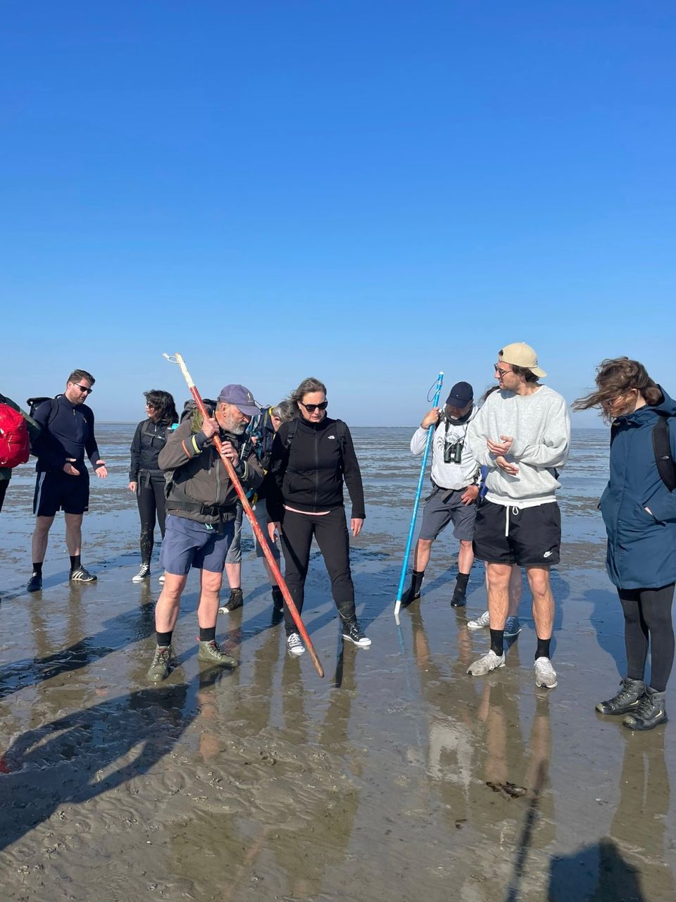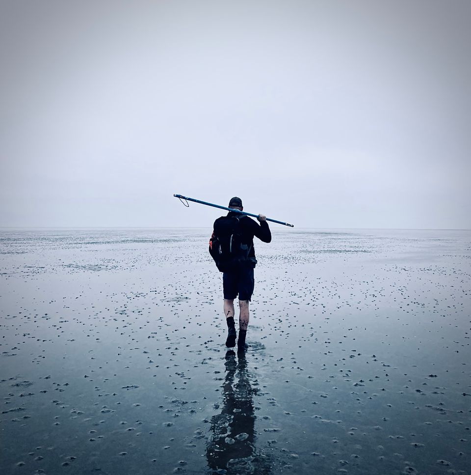 Waar mijn nieuwe exemplaar aan alle kanten glimt en loopt te pronken met mooie woorden, heeft de wadloopstok van Koos de meeste verf in de voorbije jaren verloren. Sporen van talloze tochten. Tochten die ze, als trouwe vrienden, met elkaar hebben beleefd. Bij het zien van deze twee wadloopstokken was het overduidelijk en begreep ik mijn gemis naar mijn oude stok. Het is niet gewoon ‘2 meter stok’ of een ‘fancy gadget’. Ergens in de schuur moet hij staan, aan de kant gezet. Ik beloof hardop in mijzelf dat tijdens de volgende tochten mijn oude trouwe wadloopstok weer meegaat. En hoop dat we samen langzaam millimeter voor millimeter slijten tijdens onze talloze tochten over het wad.
