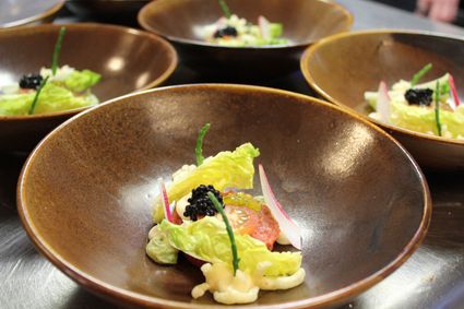 Venkelsalade, waddengarnaal, gel van garnaal, gepekelde courgette, koolrabi, ingelegde waddenoester, schuim van gerookte waddenoester, komkommerkruid, Vlielandse kruiden vinaigrette