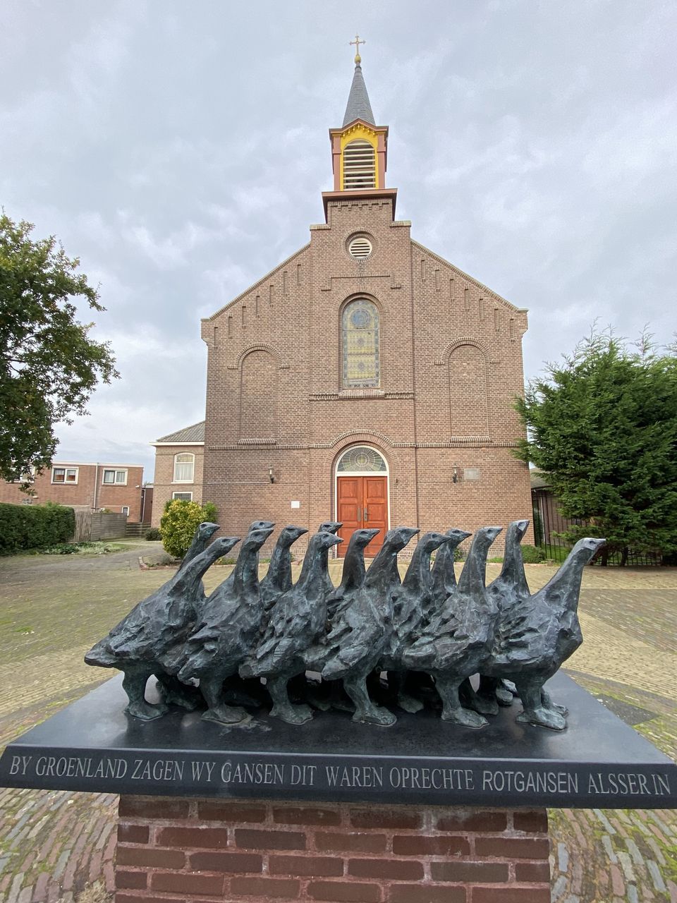 De Wieringer rotgans staat voor trouw en waakzaamheid. Waar anders vind je een standbeeld, een gemeentevlag en het gemeentewapen zo prominent van deze vogels. Er zijn ook nog eens veel bewoners met de naam Rotgans. Het beeld is in 1982 ontworpen door Theo Mulder en heeft jaren in het gemeentehuis van Wieringen gestaan. De vijftien ganzen stonden symbool voor de dertien raadsleden, de burgemeester en de gemeentesecretaris. Het beeld is naar de Hoofdstraat verplaatst toen Wieringen bij Hollands Kroon hoorde. Rotganzen leven op de buitendijkse schorren en slikken om gras en zeekraal te eten en gaan dan weer naar het zoete binnenwater om te drinken. In de wintermaanden is de rotgans ook op Wieringen te vinden. Ze kennen hier alle woalkes en krochtjes. Begin oktober arriveren ze uit het koude noorden. De zwartbuikrotgans vliegt van Siberië naar Wieringen om hier te overwinteren. Als het voorjaar wordt, gaan ze weer noordelijker.