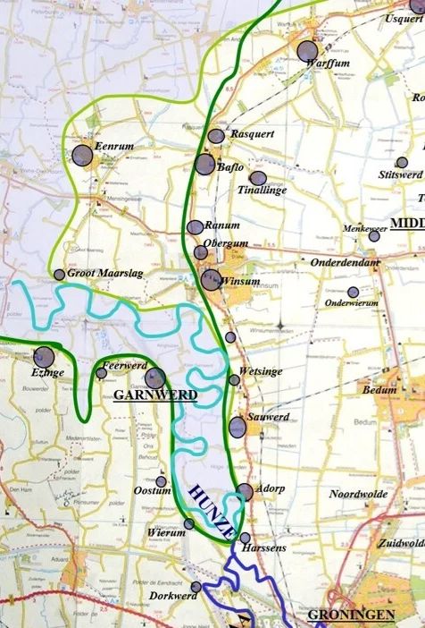 De Hunze, ooit een machtige rivier die de stad Groningen verbond met de Waddenzee, heeft een landschap gevormd dat nog altijd zichtbaar is in de dorpen langs haar oude oevers. Van Adorp en Sauwerd tot Winsum, Baflo en Warffum, de nederzettingen langs de oostoever vertellen het verhaal van een dynamisch verleden waarin water, bewoning, landbouw en handel een centrale rol speelden.