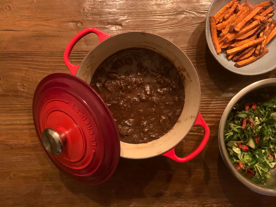 Voeg het vlees toe aan het biermengsel en zet de pan op het laagtse vuur (eventueel met een sudderplaatje) minimaal 4 uur op. (het liefst nog langer)