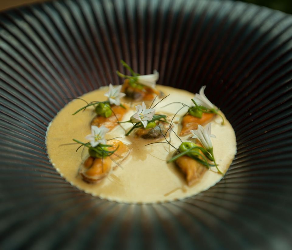 Sla de crème fraîche met de bieslook olie op en maak een quenelle in het bord, garneer met de overgebleven mosselen en een paar takjes zeebanaan.