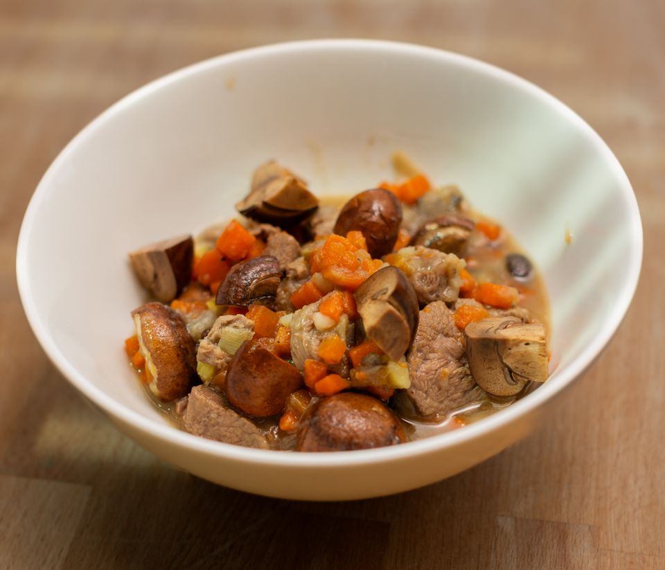 Snijd de prei, kastanjechampignons en aardappels in de gewenste vorm en voeg toe aan de stoofpot.